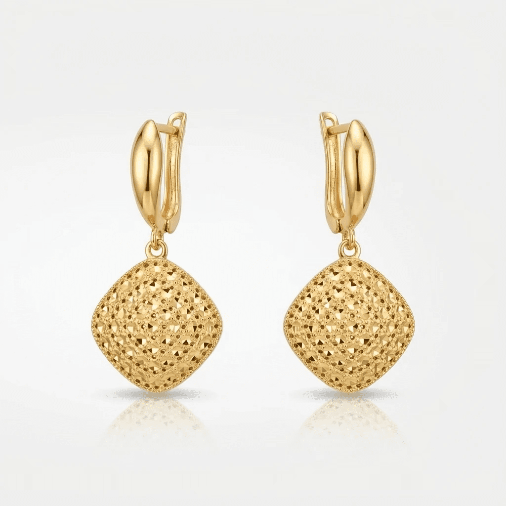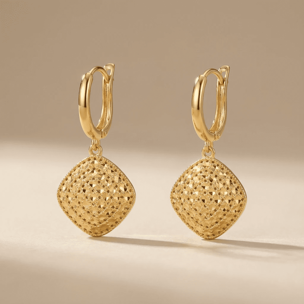گوشواره طلای آویزی آوا با طراحی لوزی‌شکل و بافت تراش‌دار، انتخابی شیک و دلنشین برای خانم‌هایی‌ست که به ظرافت و درخشش اهمیت می‌دهند. سطح تراش‌خورده‌ی پلاک لوزی، نور را به‌زیبایی منعکس می‌کند و جلوه‌ای خاص و مجلسی به استایل شما می‌بخشد.
