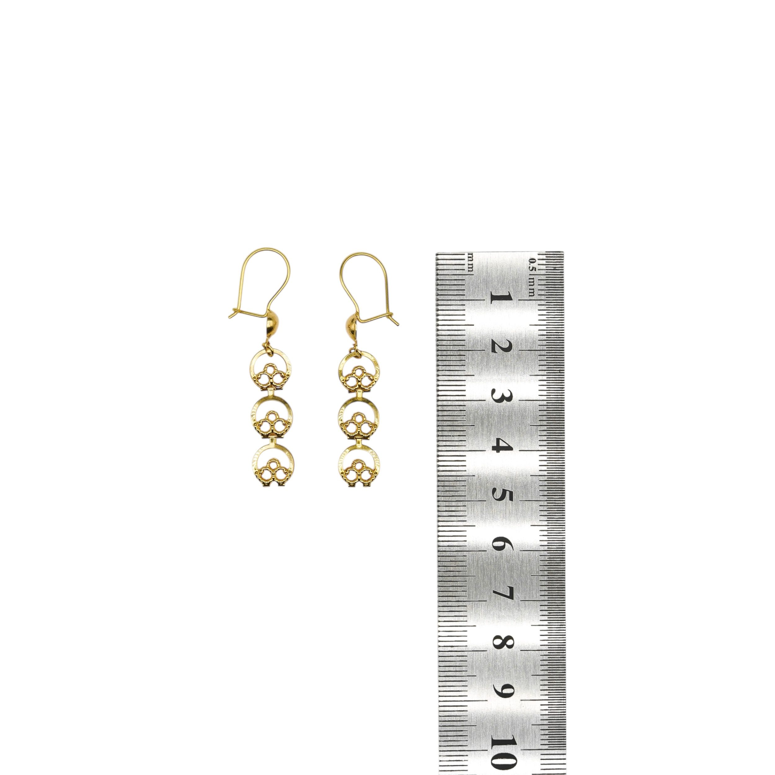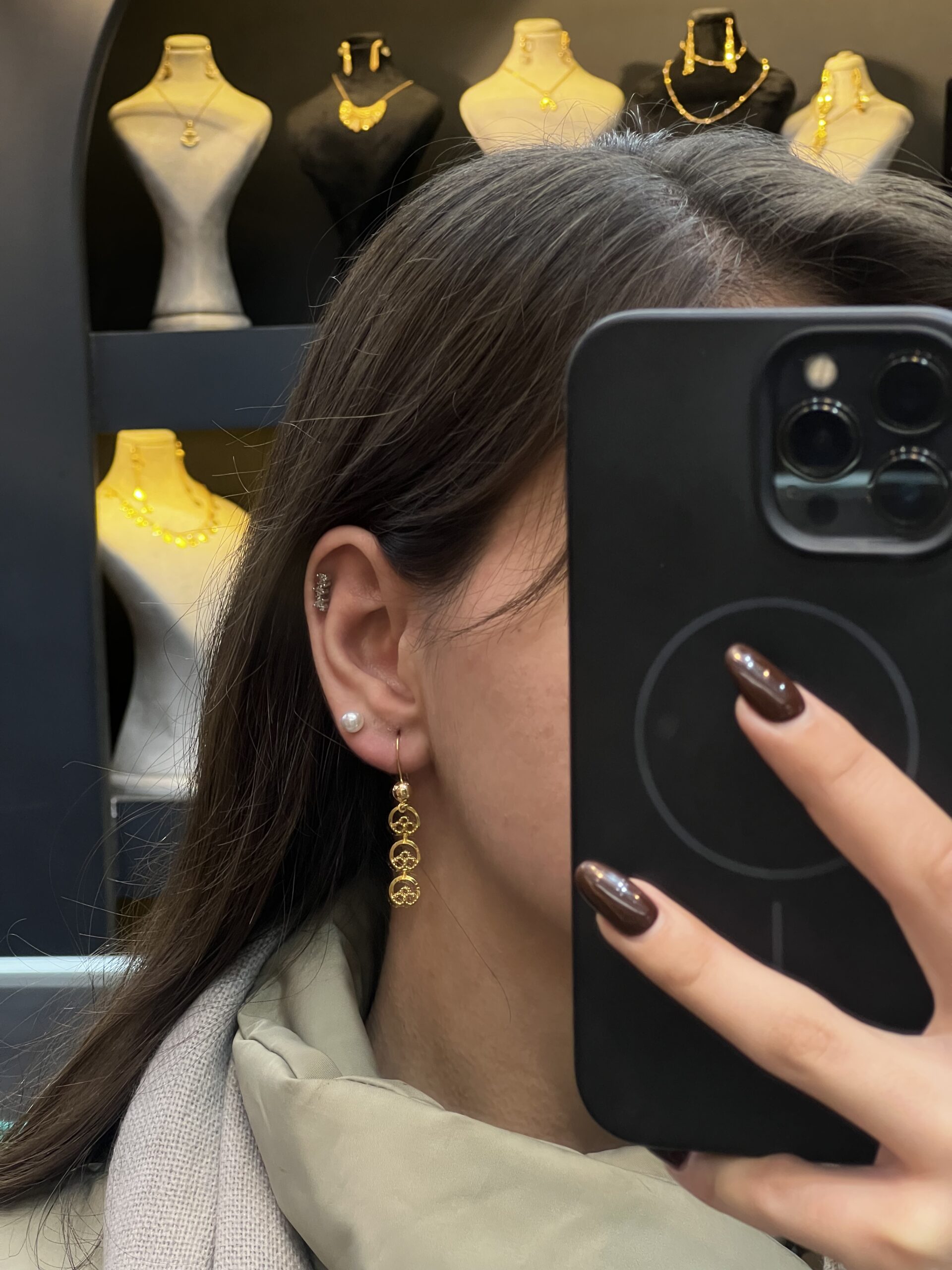 شرح کامل محصول گوشواره بیروتی آویز زنانه ماهان گُلد با الهام از طراحی‌های کلاسیک لبنانی، دارای پلاک‌های دایره‌ای کوچک با...